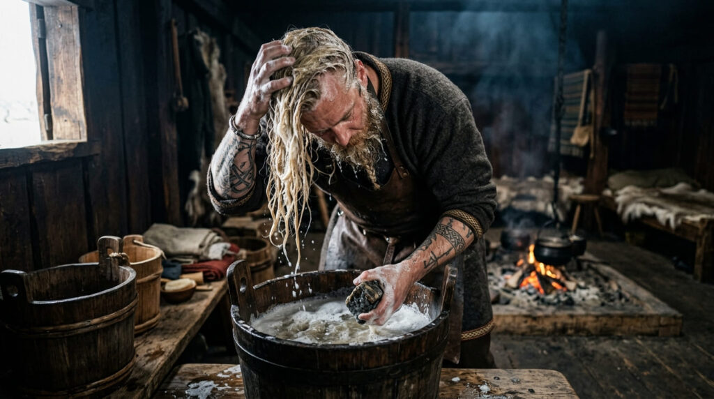 Esse sabão era tão forte que não apenas removia a gordura e a sujeira mais pesada, mas também tinha um efeito colateral: descoloria o cabelo. Homens com cabelos mais escuros usavam esse sabão para clarear os fios e a barba, buscando o ideal de beleza nórdico. Além disso, a soda cáustica era excelente para matar piolhos e outros parasitas, garantindo que o couro cabeludo permanecesse saudável mesmo em longas viagens marítimas.