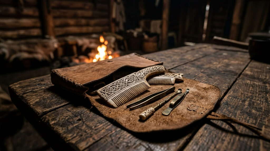 Os pentes Vikings eram verdadeiras obras de arte. Feitos geralmente de chifres de cervo ou ossos de baleia, eles eram decorados com padrões geométricos complexos. Ter um pente não era apenas funcional; era um símbolo de status. O ato de pentear o cabelo diariamente era fundamental, e muitos guerreiros eram enterrados com seus pentes para garantir que estivessem apresentáveis no Valhalla.